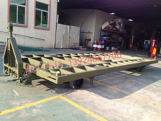 品牌:南工,型號:NGTT20DBM-25/80-8S,品名:裝甲20T雙牽引平板車,載重:20T,板面尺寸:2.5*0.8米,輪胎:22*10*16實(shí),顏色:軍綠色,自重:4400KG,